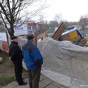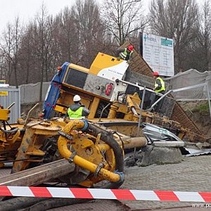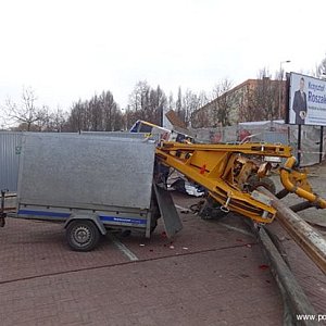 Przewrócona maszyna (26.11) do wbijania pali na placu budowy nowego targowiska w Śremie tylko w niewielkim stopniu uszkodziła przyczepkę zaparkowanego w pobliżu samochodu.