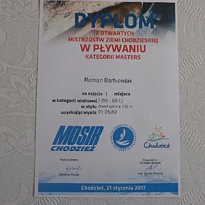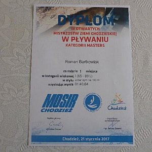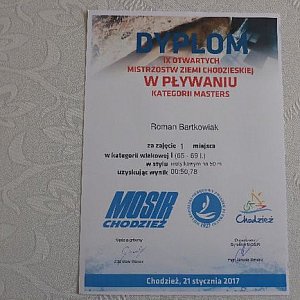 21 stycznia na pływalni "Delfin" w Chodzieży odbyły się IX Otwarte Integracyjne Mistrzostwa Ziemi Chodzieskiej w Pływaniu w kategorii Masters.Spośród wielu kategorii Roman Bartkowiak startował w kategorii I tj. 65-69 i zdobył: 50m stylem motylkowym I miejsce z czasem 00:50,79s.; 100m stylem dowolnym zajął I miejsce z czasem 1:26,62 s i w kategorii 100 m stylem zmiennymn I miejsce z czasem 1:40,64 s.