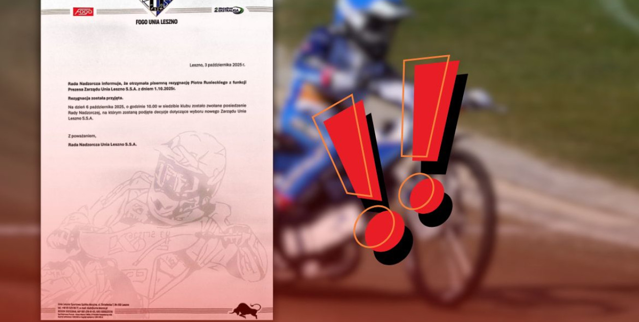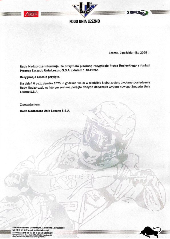 Prezes Unii Leszno, Piotr R., złożył pisemną rezygnację ze stanowiska. Rada nadzorcza klubu poinformowała, że rezygnację przyjęto, a w poniedziałek 6 października o godz. 10:00 zbierze się w sprawie wyboru nowego zarządu spółki. Informację podał serwis Leszno24.