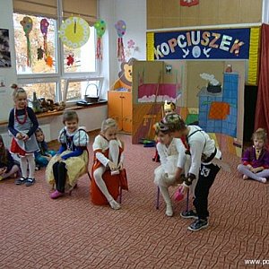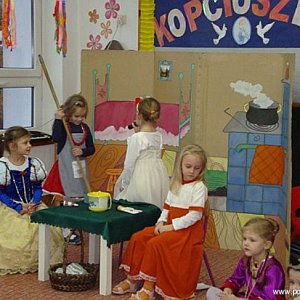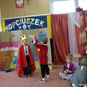 Dzieci prezentują sztuki o różnej tematyce w zależności od pory roku, aktualnych potrzeb, możliwości przedszkolaków czy zainteresowań. Tak też było w czwartek 27 listopada. Grupa „Słoneczka” dzieci pięcioletnich, która w przyszłym roku opuści już mury przedszkola zaprezentowała „KOPCIUSZKA”. Jest to znana i lubiana bajka, dlatego dzieci chętnie do niej sięgają. Mali aktorzy świetnie odnajdowali się na scenie wśród wyszukanych dekoracji oraz rekwizytów i doskonale odtwarzali swoje role. Pięcioletni Kopciuszek zamiatał podłogę, wycierał kurze, czyścił szmatką meble i dogadzał wybrednym siostrom, które piłowały paznokcie i nacierały kremem dłonie, aby nie uszkodzić swoich delikatnych paluszków. Punktem kulminacyjnym był oczywiście bal, na którym dwórki i dworzanie tańczyli ubrani w stroje z epoki Ludwika XIII misternie przygotowane przez rodziców. Bal przerwało bicie zegara i ucieczka nieznanej panny. . . Dziewczynka odtwarzająca rolę Kopciuszka miała nie lada zadanie, bowiem musiała się przebierać aż dwa razy, ale poradziła sobie z tym rewelacyjnie.