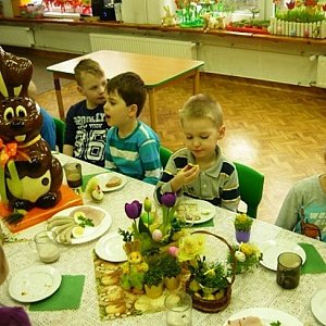 Rano dzieci zasiadły do pięknie nakrytego stołu i zjadły pyszne, świąteczne śniadanie. Następnym punktem świątecznego dnia był słodki poczęstunek w holu przedszkolnym w postaci wielkiego Wielkanocnego Zająca podarowanego przez rodziców. Na zakończenie zawitał do przedszkola zajączek wielkanocny z prezentami.
