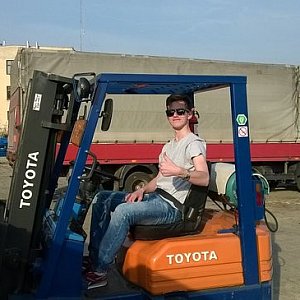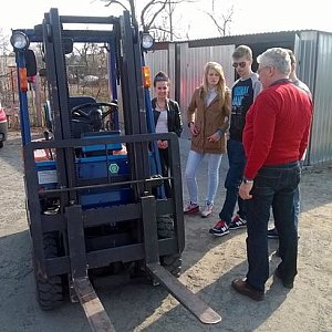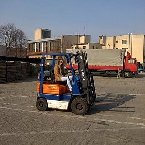 Po ukończeniu zajęć z teorii, spotkania przeniosły się na plac, gdzie zaczęliśmy część praktyczną kursu. Na początku uczyliśmy się jazdy w przód i w tył, gdy opanowaliśmy te czynności weszliśmy na wyższy poziom trudności i zaczęliśmy przewozić palety z miejsca na miejsce. Byliśmy pod wrażeniem jak dużym zaufaniem obdarzył nas p. Kaczmarek pozwalając nam wjeżdżać tym pojazdem do garażu. Mimo naszego braku doświadczenia sprzęt nie został uszkodzony. Jazda na wózku nie była taka trudna jak nam się wydawało.