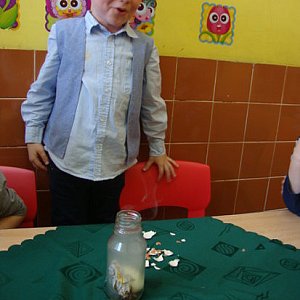 I właśnie w nawiązaniu do tradycji świąt, które już niebawem w grupie „Słoneczka” w Przedszkolu „Pod wierzbami” jajko było „głównym bohaterem” zabaw badawczych. Dzieci przypomniały, że jajko jest zbudowane z białka i żółtka oraz dowiedziały się, w jaki sposób poznać, czy jest ono surowe, czy ugotowane. Nawet same wprawiały je w ruch obrotowy. Zanurzyły je również w occie po to, by zobaczyć, co potrafi on ze skorupką jajka zrobić. Maluchy oglądały również lewitujące jajko, ale najwięcej radości sprawiło im wciągnięcie jego do wnętrza butelki przez niewidzialną siłę. Wszystkie eksperymenty zostały w prosty sposób wyjaśnione dzieciom – oczywiście na miarę ich możliwości.