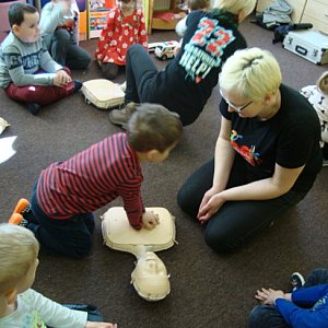 We wtorek 28 marca w Przedszkolu „Pod wierzbami” dzieci z grupy „Słoneczka” oraz „Motylki” gościły panie, które są członkami Śremskiej Grupy Nieustannych Optymistów „Krówka Mała” i opowiadały oraz demonstrowały udzielanie pierwszej pomocy przedmedycznej na mini fantomie „Małej Ani”. Bowiem udzielanie pierwszej pomocy jest obowiązkiem wszystkich, dlatego z tą tematyką należy oswajać już najmłodszych. To właśnie dzieci często nie posiadają oporów i nie odczuwają strachu, bo działają instynktownie, o czym coraz więcej słyszy się w mediach.