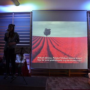 Jej rozważania na temat uczniów i ich postrzegania patriotyzmu przerywały utwory poetyckie i muzyczne. Niezwykle kameralny spektakl miał za zadanie skłonić młodą widownię do refleksji na temat swojego stosunku do ojczyzny. W spektaklu obejrzeć mogliśmy Zuzannę Nowodczyńską, Joannę Gościniak, Aleksandrę Kicińską, Monikę Steinitz, Damiana Koniecznego. Na szkolnej scenie gościnnie wystąpił także absolwent Ekonomika Błażej Wawrzyniak.