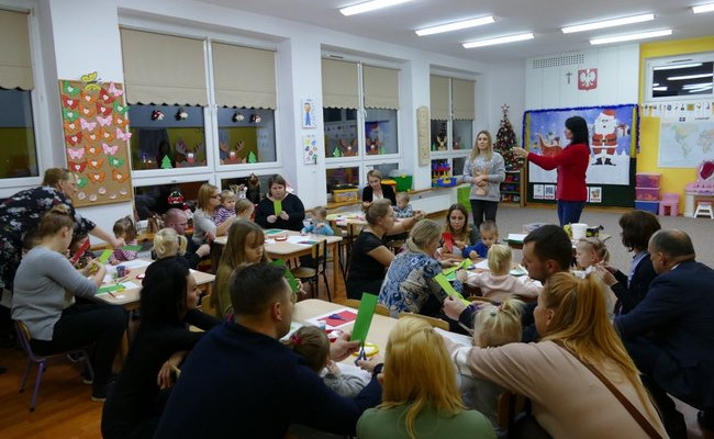 Maluszki wraz z rodzicami dzielnie wykonywały zadania od Świętego Mikołaja. Dzieci miały okazję gimnastykować się podczas zimowych zabaw ruchowych, zaśpiewać mikołajkową piosenkę, zagrać w śnieżnej orkiestrze a także wykonać małymi rączkami piękną choinkę i pomysłowo ja ozdobić.