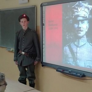 W związku z obchodami 100 rocznicy wybuchu powstania wielkopolskiego uczniowie klas gimnazjalnych oraz VII a i VIII a uczestniczyli w niezwykłych lekcjach muzealnych „Powstańczy zryw”, które poprowadził pracownik Muzeum Śremskiego p. R. Franczak. Uczniowie mogli obejrzeć prezentację multimedialną, wysłuchać wykładu na temat zrywu Wielkopolan oraz zapoznać się z wyglądem powstańców. Duże wrażenie i zaciekawienie wywołali uczniowie, którzy na chwilę stali się powstańcami prezentując mundur i broń z tego okresu. Bardzo ciekawym elementem wykładu było opowiadanie o działaniach mieszkańców ziemi śremskiej oraz o ich wkładzie w odzyskanie niepodległości. Taka lekcja historii na pewno na długo pozostanie w pamięci uczniów.
