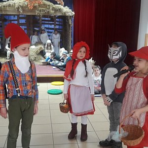 Dnia 12 grudnia odbyło się w naszej szkole SPOTKANIE POD GWIAZDĄ. Jasełka przygotowane przez uczniów klas pierwszych wprowadziły w nastrój zbliżających się świąt rodziców, a także dzieci z Przedszkola Janka Wędrowniczka. Jasełka miały charakter bajkowy. Na scenie oprócz Aniołów, Pasterzy, Maryi i Józefa gościły różne postaci z bajek, np. Czerwony Kapturek, Jaś i Małgosia, Królewna Śnieżka i Siedmiu Krasnoludków, Wiedźma, Wróżki. Dzieci prezentowały nie tylko swoje talenty aktorskie, ale również muzyczno-wokalne. Inscenizacja przeplatana była pięknymi kolędami i piosenkami. Zaproszeni rodzice, a wcześniej dzieci z przedszkola, nagrodzili występ gromkimi brawami. Pani Dyrektor podziękowała małym wykonawcom i złożyła wszystkim świąteczne życzenia.