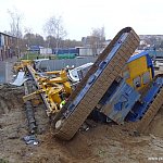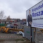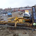 Przewrócona maszyna (26.11) do wbijania pali na placu budowy nowego targowiska w Śremie tylko w niewielkim stopniu uszkodziła przyczepkę zaparkowanego w pobliżu samochodu.
