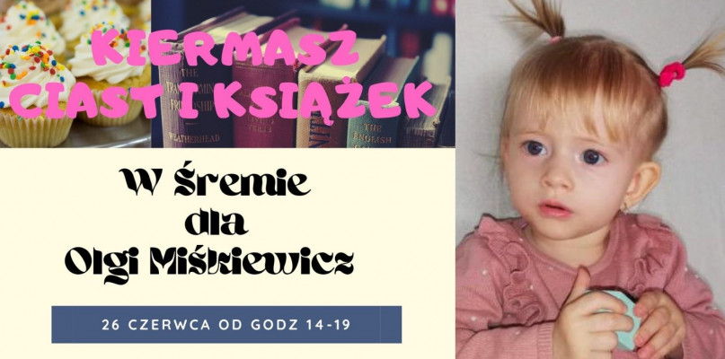 26 czerwca na terenie Szkoły im. Kawalerów Orderu Uśmiechu w Śremie (ul. Wyszyńskiego 11) w godz. 14.00 – 19.00 odbędzie się kiermasz ciast i książek dla małej Olgi Miśkiewicz.