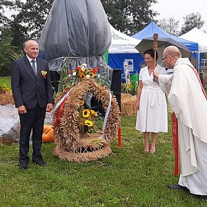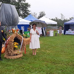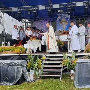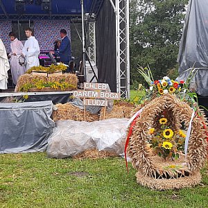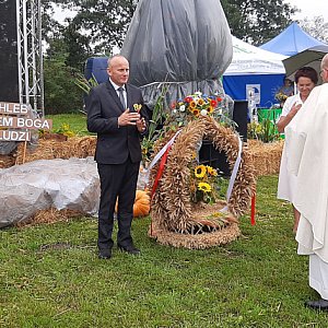 Wyjątkową uroczystość na boisku w Kołacinie zapoczątkował barwny korowód. Tuż po godzinie 15.00 rozpoczęła się Eucharystia, której przewodniczył ks. Artur Kosior proboszcz parafii we Mchach. Bezpośrednio po nabożeństwie został poświęcony wieniec przyniesiony przez starostów dożynkowych: Dorotę Skierę i Romana Klinowskiego. Tradycyjnym elementem dożynek było przekazanie wypieków osobom, które w różny sposób zaangażowały się w tegoroczne żniwa i pomoc rolnikom. Burmistrz Książa Wlkp. Teofil Marciniak dzielił się chlebem z osobami zebranymi na uroczystości a w swoim wystąpieniu skierował do rolników słowa uznania oraz wdzięczności za ciężką pracę. W podobnym tonie wypowiadał się starosta śremski Zenon Jahns oraz poseł Zbigniew Dolata, który wiele czasu poświęcił obecnej sytuacji w Europie i jej wpływie na rolnictwo.