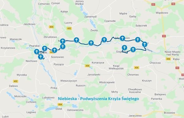 Trasa 2 - Niebieska Podwyższenia Krzyża Świętego - 41 km. Śrem kościół pw. Mądrości Bożej – Śrem kościół pw. NSJ – Śrem kościół pw. bł. Michała Kozala – Śrem kościół pw. NMP Wniebowziętej - Kawcze – Łęgi Mechlińskie - Mechlin kaplica pw. Chrystusa Króla – Dąbrowa – kierunek Kotowo – Biały Gościniec – Józefowo – Kępa Mała – Kępa Wielka – Potachy – Młodzikowo – Sulęcin – Solec kościół pw. św. Katarzyny Aleksandryjskiej – PRZEPRAWA KŁADKĄ MOSTU KOLEJOWEGO NA DRUGĄ STRONĘ WARTY - Świączyń - Gogolewo kościół pw. Podwyższenia Krzyża Świętego.