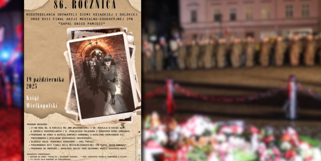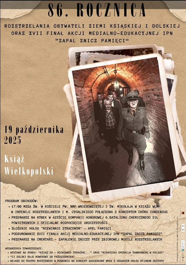 W 1939 roku, w ramach operacji „Tannenberg”, na rynku w Książu Wielkopolskim Niemcy rozstrzelali 17 mieszkańców. Dla upamiętnienia tej zbrodni w niedzielę, 19 października 2025 r., o godz. 17.00 odbędzie się msza święta w Kościele pw. Najświętszej Maryi Panny Wniebowziętej i św. Mikołaja w Książu Wlkp., połączona z koncertem Chóru Consensus.
