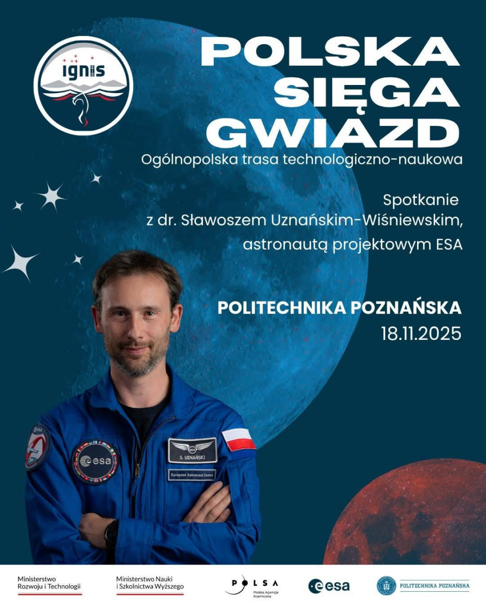 Pod hasłem „Polska Sięga Gwiazd” trwa ogólnopolska trasa technologiczno-naukowa, w ramach której organizowane są wyjątkowe spotkania z dr. Sławoszem Uznańskim-Wiśniewskim – astronautą Europejskiej Agencji Kosmicznej oraz uczestnikiem misji IGNIS. W wydarzeniu, transmitowanym we wtorek z murów Politechniki Poznańskiej, uczestniczyli także uczniowie klasy 7b ze Szkoły Podstawowej nr 1 im. Mikołaja Kopernika w Śremie, łącząc się online.