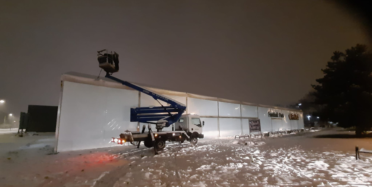 Obfite opady śniegu sprawiły, że na dachu hali treningowej REHAU Football Park zebrała się gruba warstwa ciężkiego, mokrego śniegu. Konstrukcja była mocno obciążona, a sytuacja stała się na tyle poważna, że klub natychmiast wstrzymał treningi, by zadbać o bezpieczeństwo młodych sportowców.