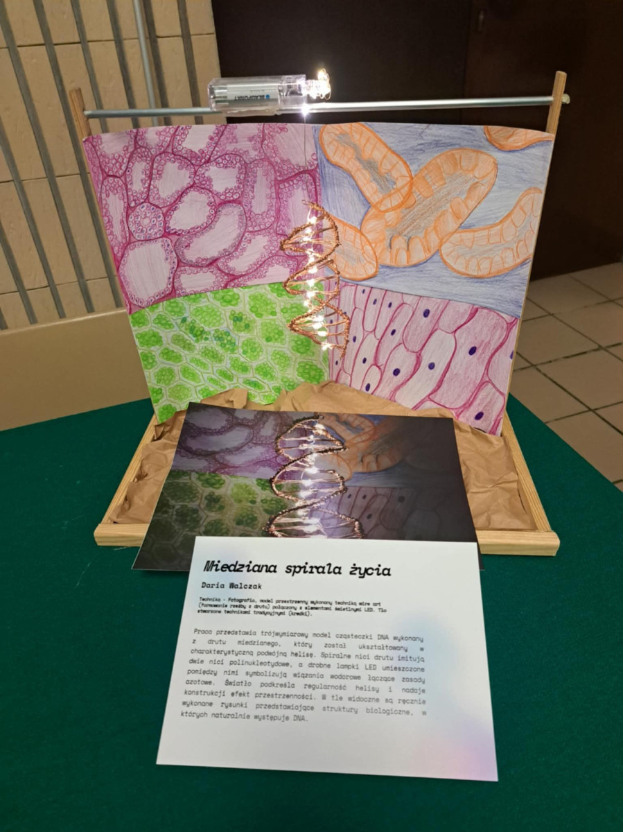 Daria przygotowała niezwykłą pracę pod tytułem „Miedziana spirala życia”. Jest to model przestrzenny wykonany w technice wire art (sztuka tworzenia z drutu), który został wzbogacony o efektowne elementy świetlne LED. Połączenie surowego metalu z nowoczesną technologią oświetleniową stworzyło unikalną kompozycję, która przyciągnęła uwagę ekspertów.