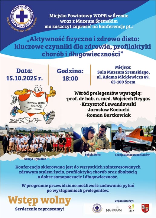 Śremski WOPR organizuje zdrowotno-sportową konferencję pn. „Aktywność fizyczna i zdrowa dieta: kluczowe czynniki dla zdrowia, profilaktyki chorób i długowieczności”. Wydarzenie odbędzie się 15 października 2025 roku o godz. 18:00 w sali Muzeum Śremskiego (ul. Adama Mickiewicza 89). Wydarzenie jest otwarte dla wszystkich zainteresowanych zdrowym stylem życia i prewencją chorób. W interaktywnej formule programu przewidziano wykłady ekspertów oraz sesję pytań.