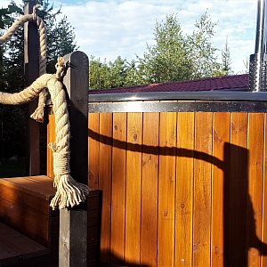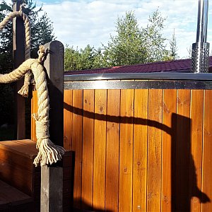 Dzięki specjalnej balii ogrodowej z hydromasażem o średnicy 2 metrów możliwe jest zorganizowanie rozluźniającej kąpieli w plenerze nawet dla 8 osób.