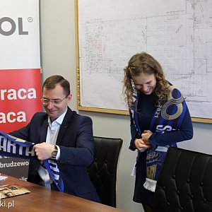 Po złożeniu podpisów na ważnych dokumentach prezesi uścisnęli sobie dłonie. Następnie przedstawiciel Warty wręczył sponsorowi biało-niebieski szalik warciarzy.