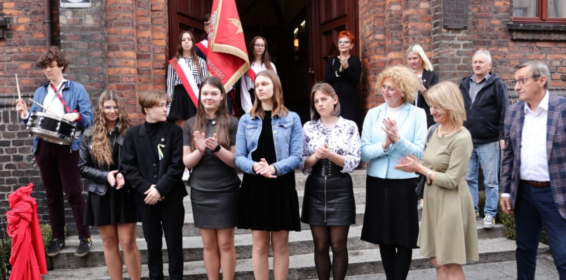 Po tym wszyscy przeszli w miejsce Galerii Wybitnych Absolwentów, gdzie odsłonięto nowy wizerunek, a następnie przed szkołę w celu prezentacji imiennego medalionu.
