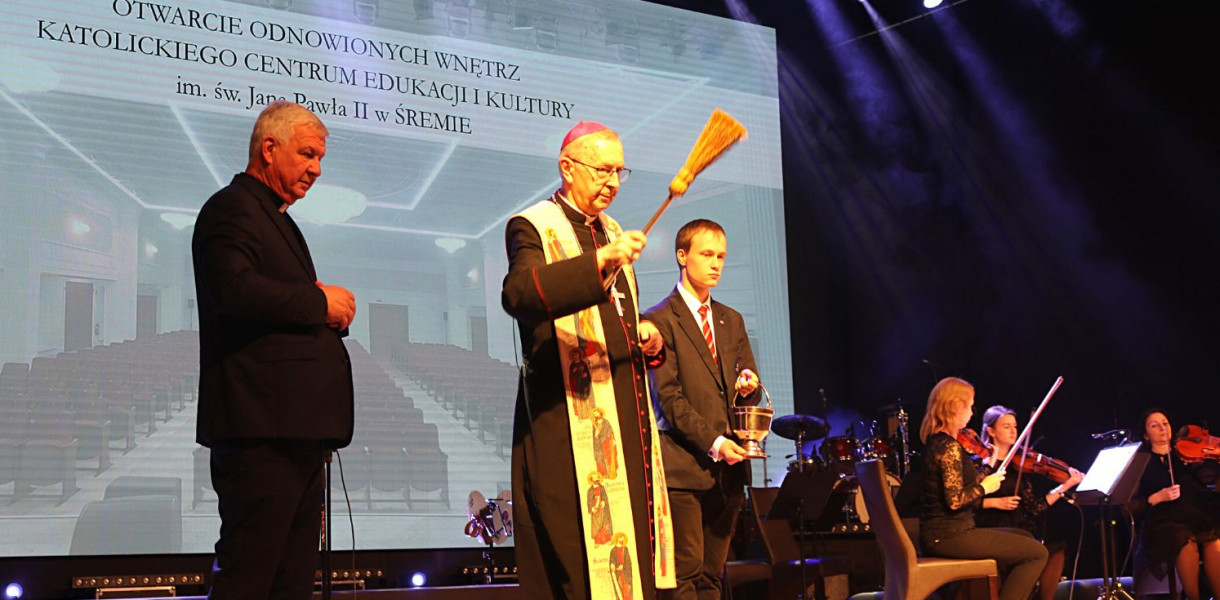 Arcybiskup Stanisław Gądecki Metropolita Poznański stwierdził, że nowa sala przypomina Operę Wiedeńską. Przypuszczał, że niemożliwe będzie zakończenie takiej inwestycji w wyznaczonym terminie. Miał rację, gdyż oficjalne otwarcie odbyło się ponad miesiąc później niż planowano. Wyraził swoje uznanie dla efektu prac. Arcybiskup dokonał poświęcenia każdego nowego wnętrza. Następnie wręczył medal kanclerzowi Ryszardowi Adamczakowi zasłużonego dla archidiecezji poznańskiej, w duchu wdzięczności za pełne poświęcenie, oddanie i zaangażowanie w tworzenie Katolickiego Centrum Edukacji i Kultury im. św. Jana Pawła II w Śremie. Podziękował też za wieloletnie i kompetentne wypełnianie obowiązków proboszcza parafii pw. Najświętszego Serca Pana Jezusa w Śremie.