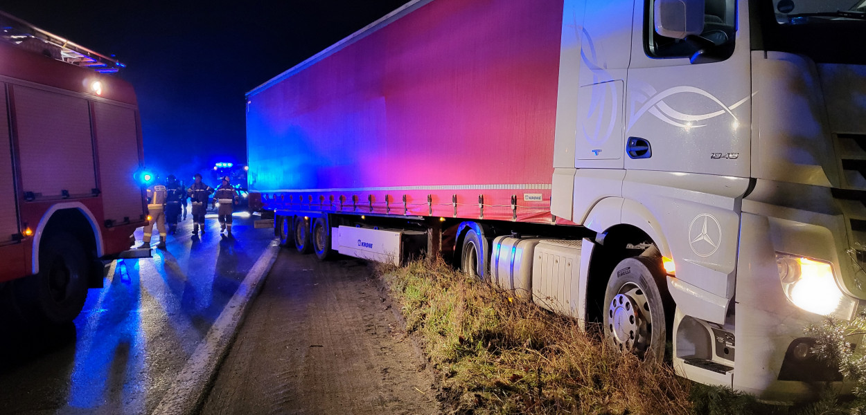 Z relacji kierującego ciężarówką wynika, iż droga w tym miejscu była bardzo śliska. Samochód zjechał na lewy pas, a następnie cały znalazł się na poboczu uderzając w skarpę z krzewami.
