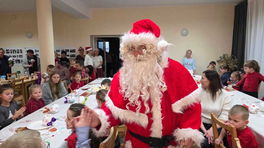 Gdy ostatnie bombki były już gotowe, w sali rozległ się dźwięk dzwonków, który zwiastował tylko jedno – wizytę Świętego Mikołaja. Gość z mroźnej krainy nie przyszedł z pustymi rękami; każde dziecko otrzymało słodki upominek. Radości nie było końca – wspólne zdjęcia, śpiewanie kolęd i zabawy przy choince dopełniły ten magiczny wieczór.